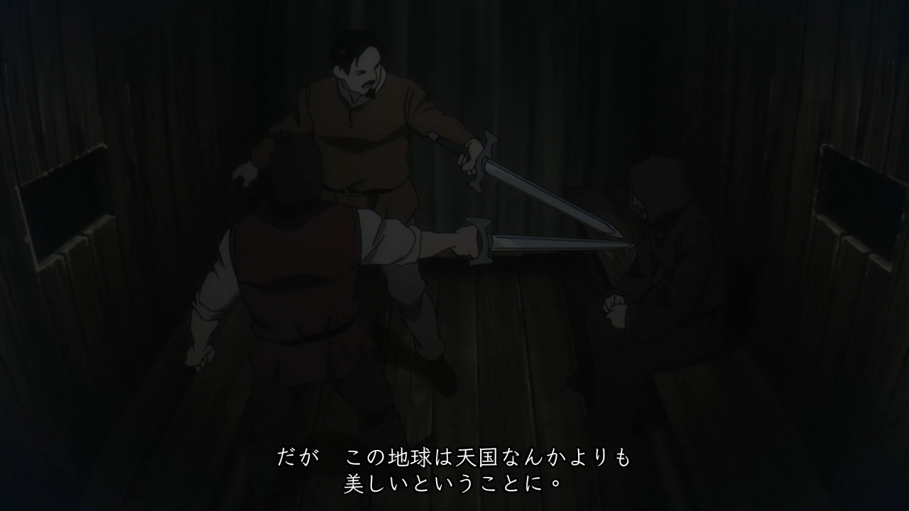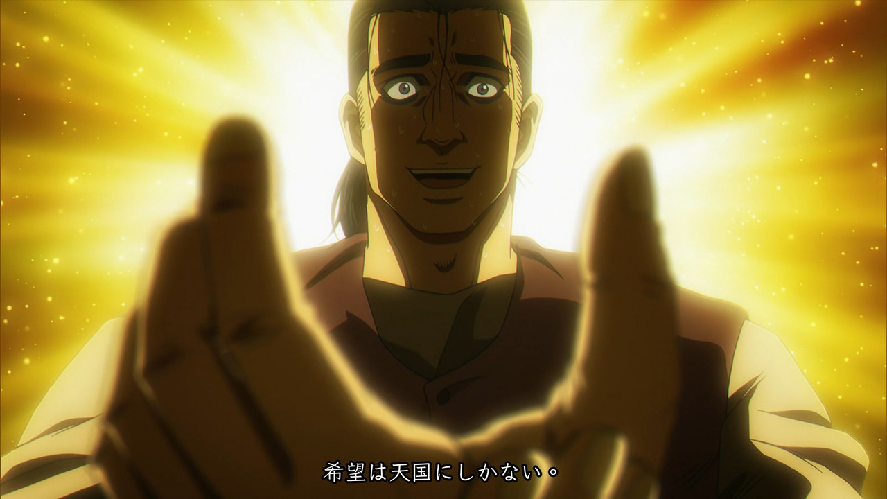 我说的一样是指看这段动画时给我的观感跟漫画一样精采,这甚至是我已经失去了初见震撼的情况之下。就算前三集也有不少不同于漫画的构图设计,这集又加了更多。前期漫画画面基本用于叙事,几乎没有或很少用画面说话不知你是否有感觉?例如波托茨基的窗前抱头,动画镜头不就调整的非常有故事感?他们不是没有为动画做调整,只是没做的这么显眼。而且本身我们就已经被漫画节奏绑住了,个人把动画每集五刷就是想洗掉既有印象,原本看起来太快的十年后此时再看也说不出到底是不是真的太快了。我真的很想知道若是初见到底会是什么感觉。