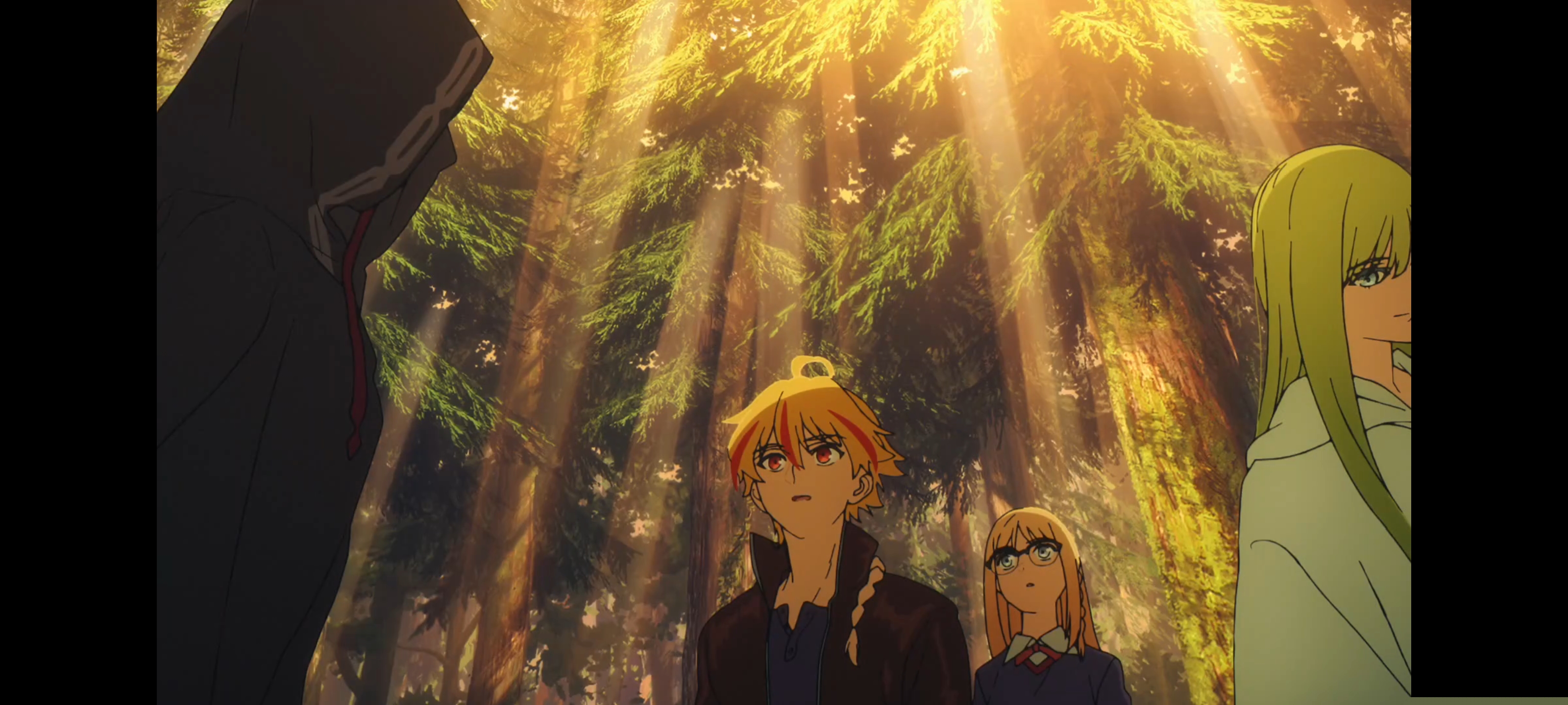 这里无疑是一个仿漫画分镜,所有的画面都是静态,唯一的移动是最后的一个分格的平移位移,并且全集仅在这一处使用。那么意义就很明确了,这是一个演出调剂,这里明显是几人正在商量,相比通常先拍拍理查、再拍拍小恩,再拍拍绫香这种三段镜头,这样一个漫画分格能很好地同时表现几人的状态,同时减轻演出的站桩、重复感。简单来说fate文戏很多,这集你会发现经常切换镜头、用各种视角来拍,其中很多并非常见的视角,几乎是要力求做到镜头处处不重复,不会让观众有枯燥感。