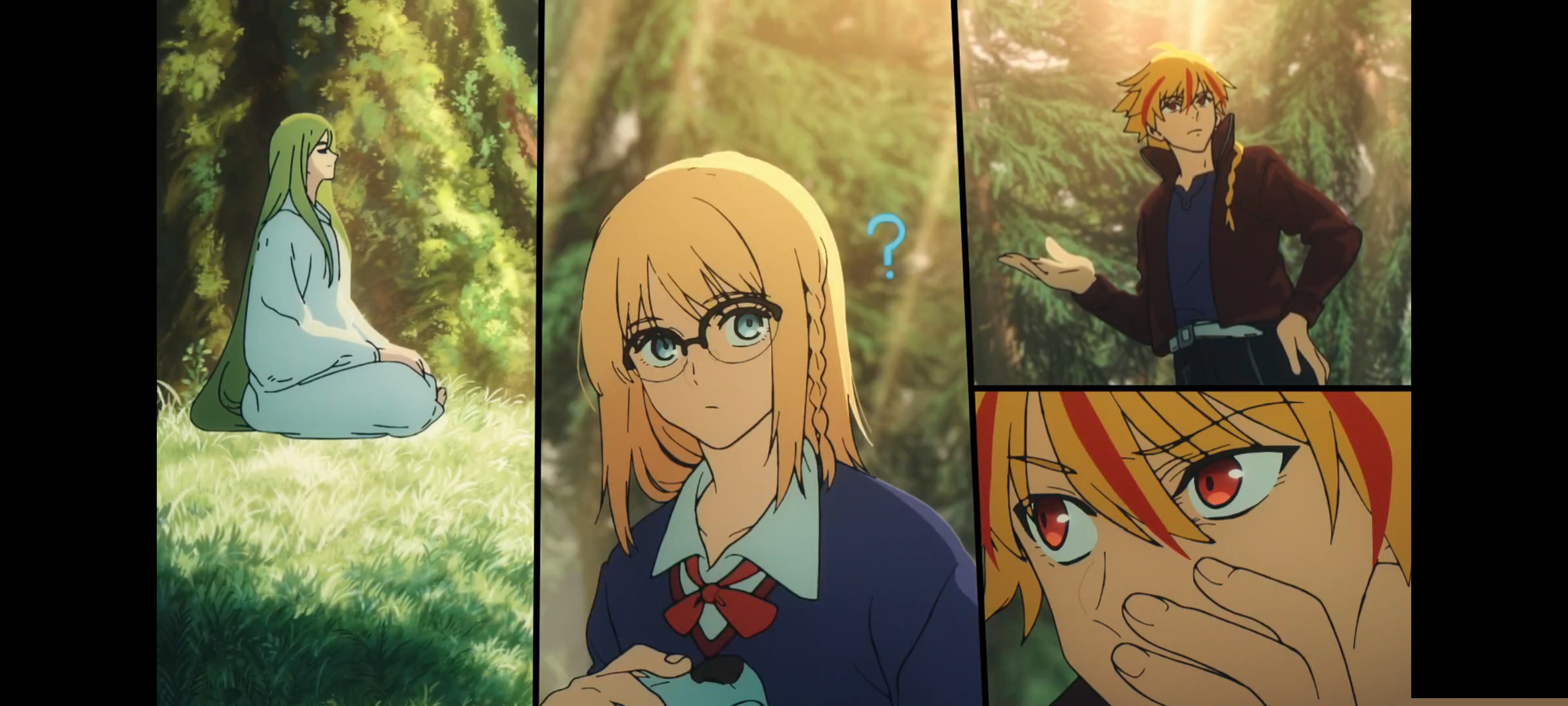 本集同样也出现了漫画分格式的多机位镜头的演出,但是出现的比较早可能看完一集有些观众都忘了,换句话这个演出完全融入到了整个单集的演出当中,不会让你“刻意”的感受到“啊快看我用了一个多机位演出”的突兀感。在这个镜头中,慢慢从2个分格增加到4个分格,再增加新镜头分格采取替换掉之前的一个镜头分格的方式实现,而不是直接出现5个分格。不同的分格画面都是直接联系的,并且几乎都是静态的,出现动画也只会在一个分格中出现。
